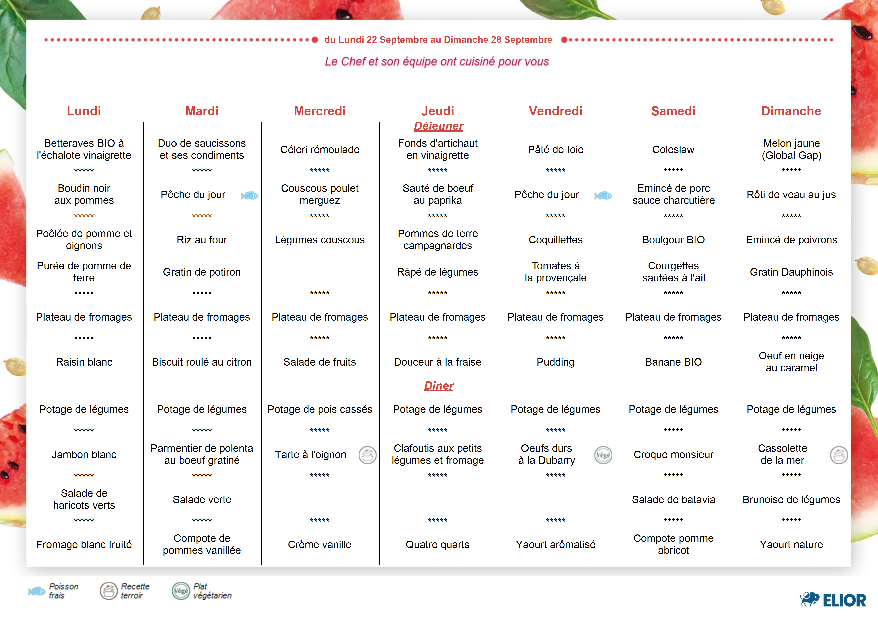 Menus de la semaine du Lundi 23 septembre 2025 au dimanche 28 septembre 2025 Le 18 septembre 2025 Le menu Le chef cuisinier et son équipe préparent chaque semaine un menu équilibré et cuisiné sur place. menus-du-lundi-23-septembre-au-dimanche-28-septembre-2025